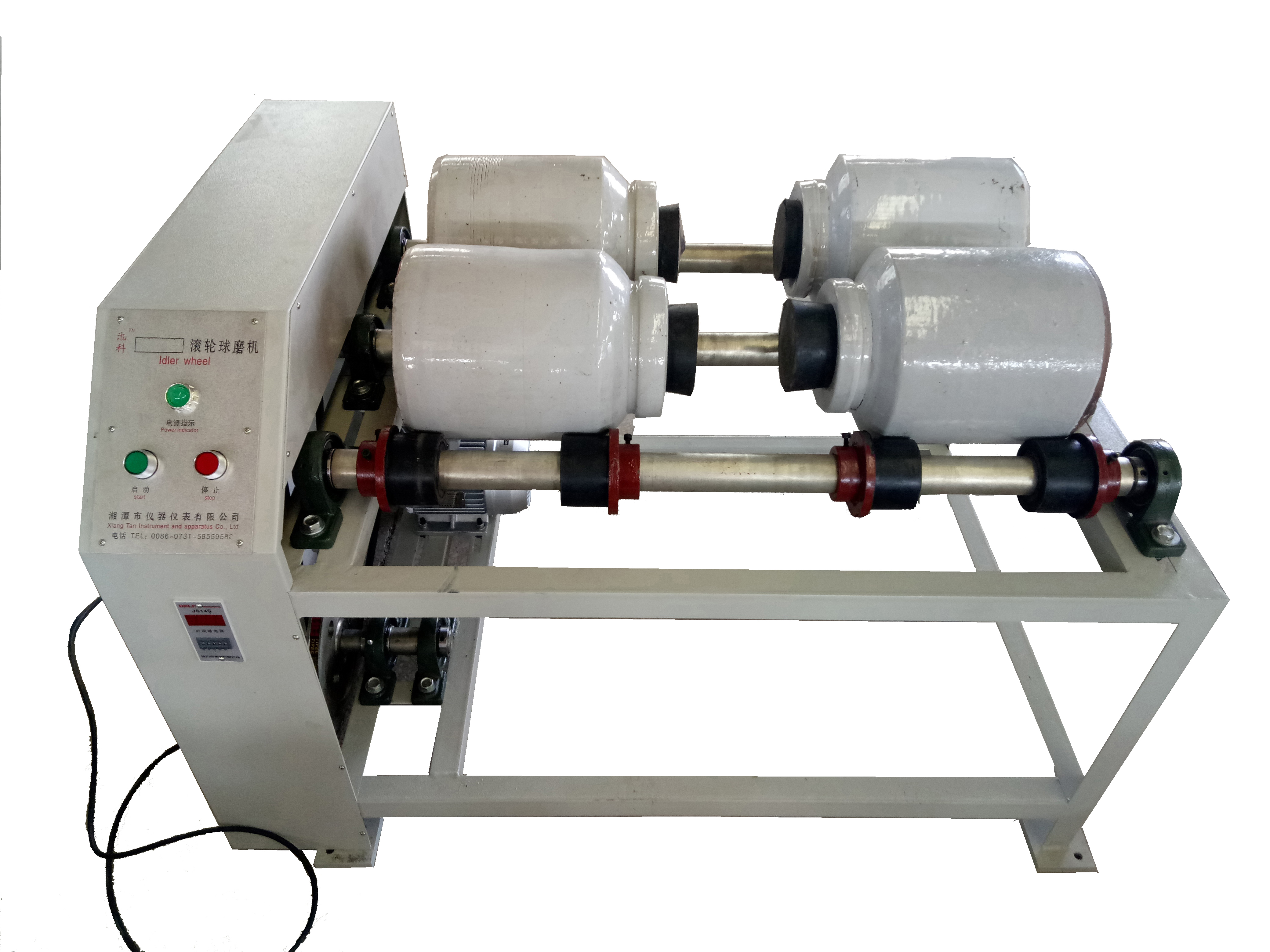 該設(shè)備由機架、電機、皮帶輪減速裝置,長軸及電器控制部分等組成。其工作原理是電機帶動皮帶減速裝置、使長軸作勻速轉(zhuǎn)動,從而帶動研磨罐轉(zhuǎn)動。