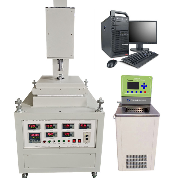 設備由冷板總成,電動加壓裝置,熱板總成(包括量熱,內(nèi)護熱,外護熱部分),數(shù)據(jù)采集控制系統(tǒng)和計算機測控系統(tǒng)組成。試樣放置在冷熱板之間,利用電動加壓裝置壓緊試樣,冷板恒溫系統(tǒng)和熱板控溫系統(tǒng)提供試樣兩面穩(wěn)定溫差,量熱器上的熱流計測量出通過試樣的熱流密度,然后計算出試樣的傳熱系數(shù)和導熱系數(shù)。