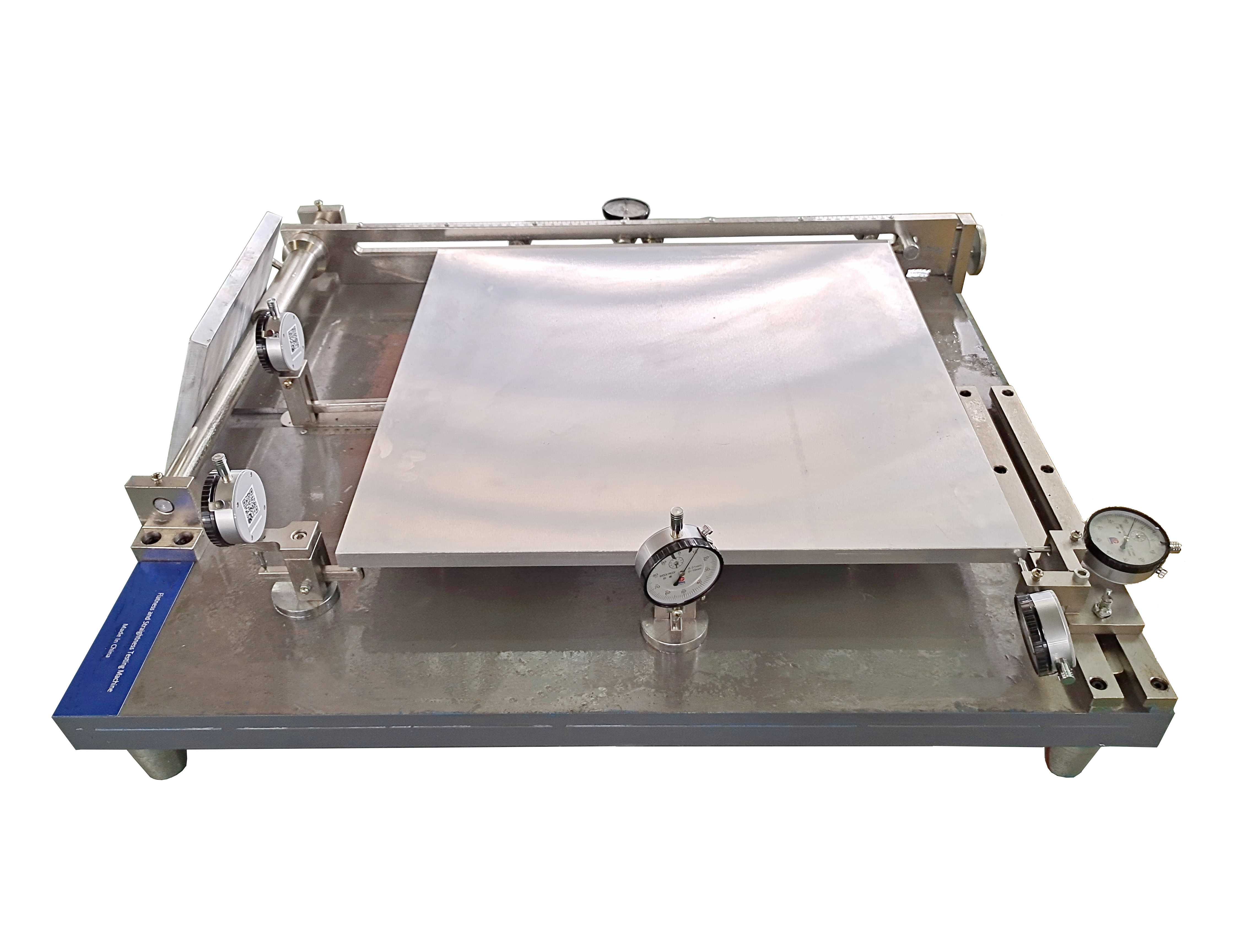 本儀器由支承平板、可移動(dòng)的左支座和右支座組成一個(gè)直角坐標(biāo)系。在平板上有三個(gè)等高支承銷與陶瓷面磚類似外形和具有理想尺寸的標(biāo)準(zhǔn)板進(jìn)行探測(cè),并將儀表值調(diào)整至適當(dāng)位置,并記下該示值。然后,以被測(cè)陶瓷面磚取代標(biāo)準(zhǔn)板,在不移動(dòng)測(cè)量點(diǎn)的情況下,分別測(cè)出六項(xiàng)指標(biāo)參數(shù)。左、右支座及中心測(cè)量支座可在平板上作平行移動(dòng),組成不同位置的空間座標(biāo),以適應(yīng)不同規(guī)格尺寸陶瓷面磚的測(cè)定。